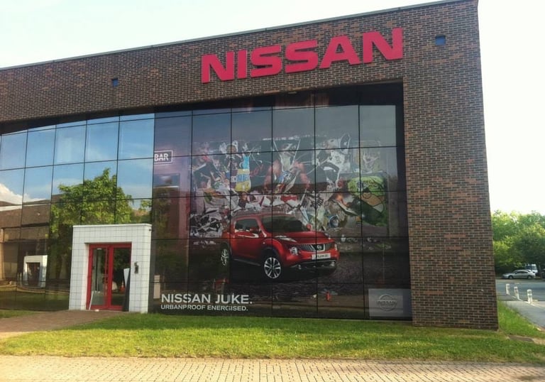 Habillage de vitrines, palissades de chantier et marquage de véhicules à Nîmes. Pose haute précision garantie sans bulles."